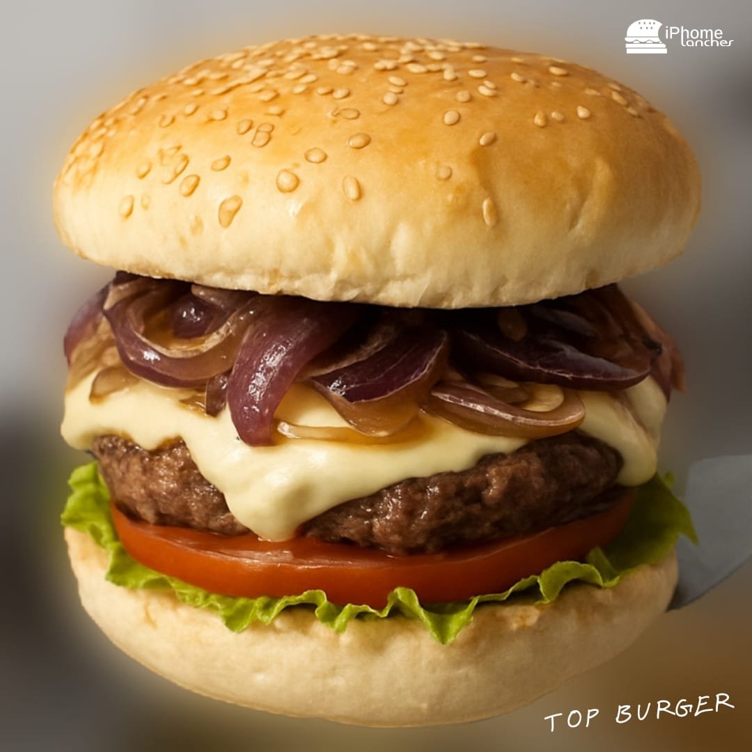 Pão com gergelim, carne, mussarela, cebola refogada, alface, tomate e maionese. Acompanha batata.